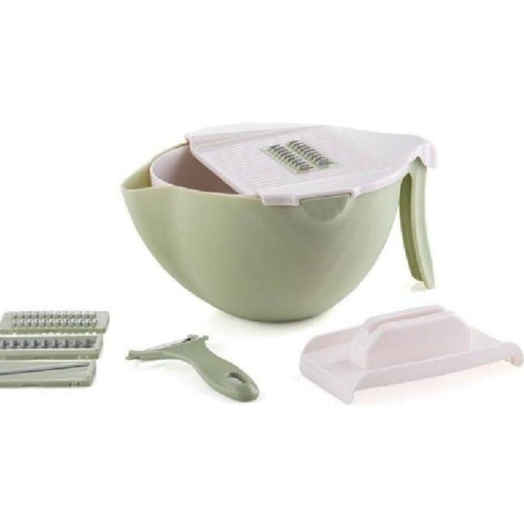 קערת מולטי שף + קולפן מגיע עם 4 סלייסרים וקולפן משמש כקערה ומסננת